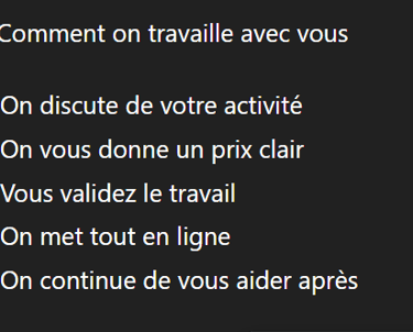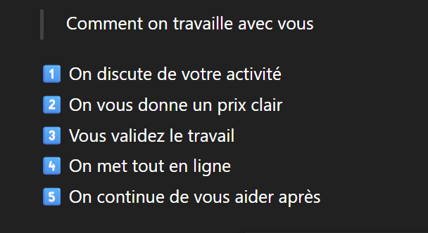 Le nom de votre entreprise, vos services, vos coordonnées, quelques photos. Si vous n’avez pas tout, nous vous aidons à construire les textes.